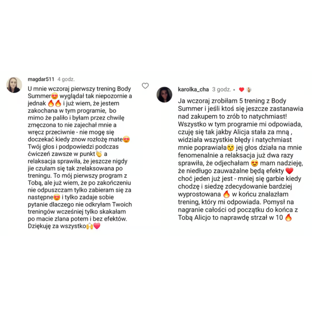 Program Body Summer znajdziesz wygodnie na dedykowanej platformie online, a nie na płytach DVD. Link i hasło otrzymasz w pliku e-booka zaraz po zakupie, więc możesz rozpocząć trening bez zbędnych formalności. Potrzebujesz jedynie Internetu i dowolnego urządzenia — smartfon, tablet, komputer albo telewizor.