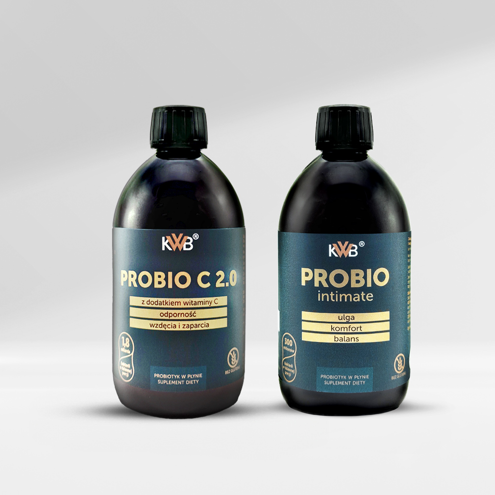 Zestaw KWB Pełna Ochrona Probio C 2.0 + Probio Intimate to holistyczne wsparcie organizmu kobiety od wewnątrz. Łączy działanie dwóch innowacyjnych, płynnych probiotyków, które wspólnie dbają o mikrobiotę jelitową, odporność oraz równowagę intymną.