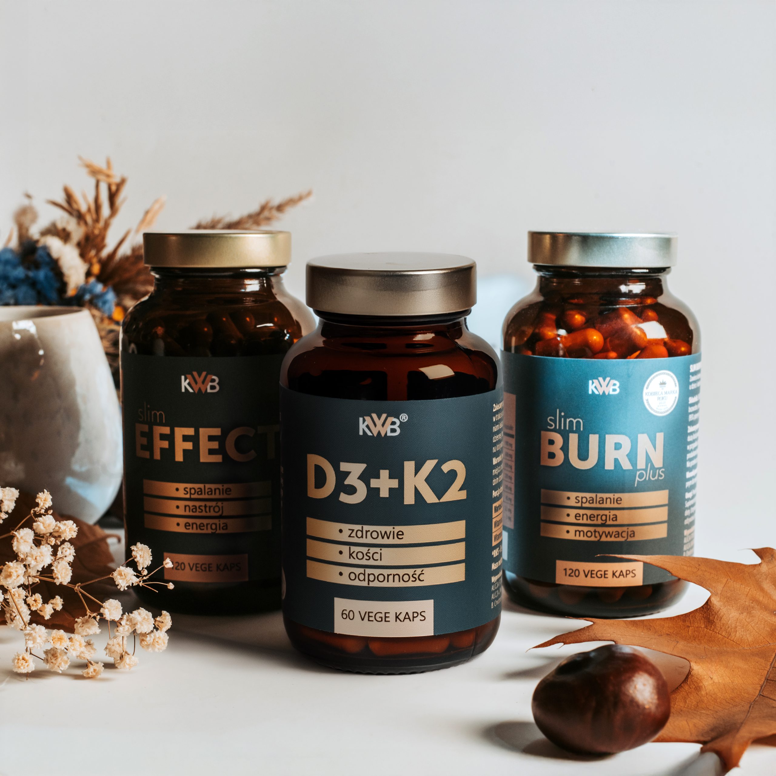 KWB Slim Burn Plus dostarcza naturalnej energii, KWB Slim Effect wspiera koncentrację i równowagę psychiczną, a KWB D3+K2 uzupełnia niedobory witaminy słońca, kluczowej dla odporności i nastroju.
