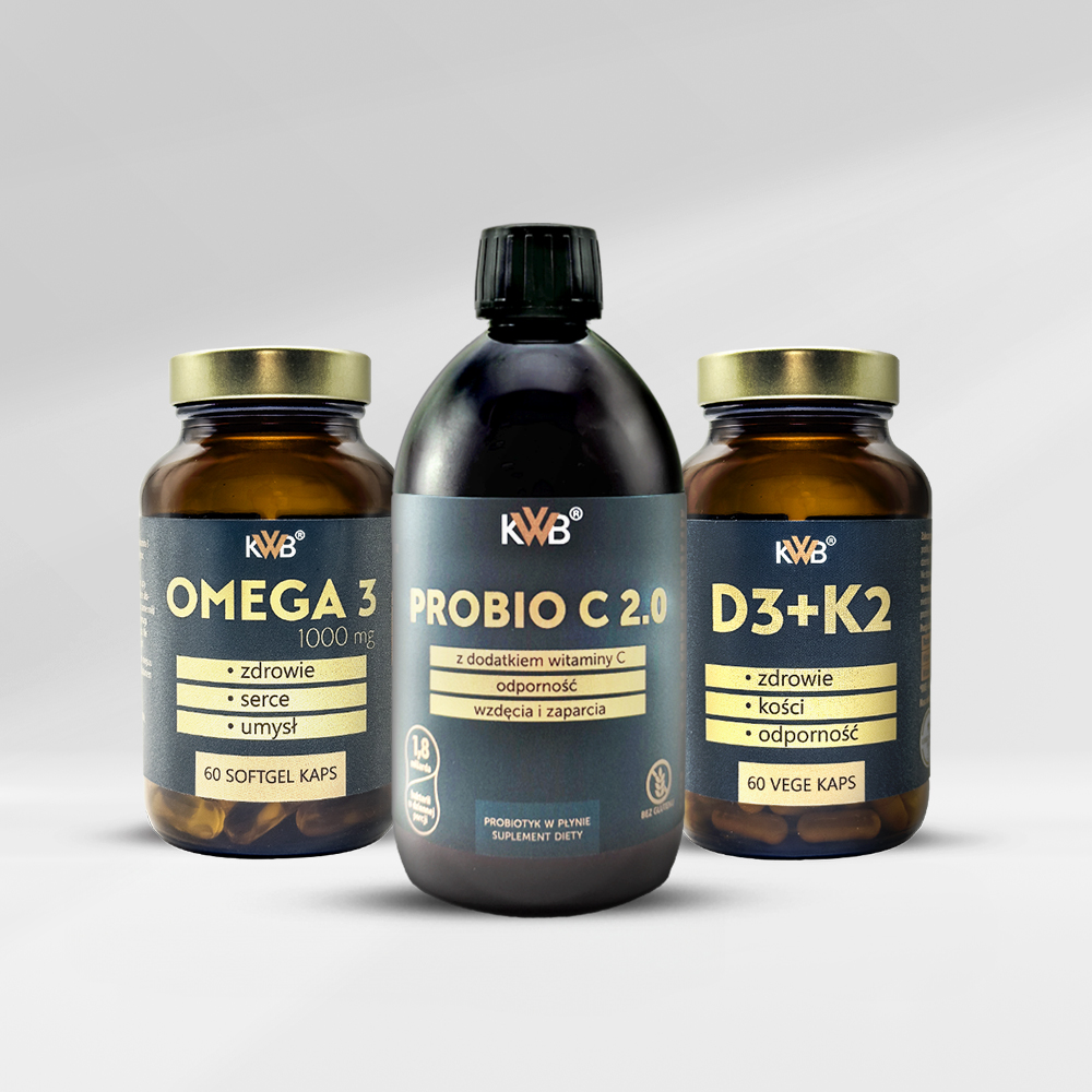 KWB Probio C 2.0 dostarcza żywe szczepy bakterii oraz witaminę C, KWB Omega 3 uzupełnia nienasycone kwasy tłuszczowe EPA i DHA, a KWB D3+K2 wzmacnia układ kostny i odpornościowy.